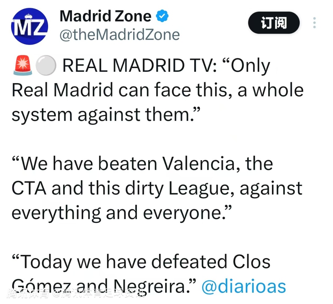 对抗一切!皇马TV:战胜瓦伦西亚外 我们还战胜了CTA和这个肮脏的联赛
