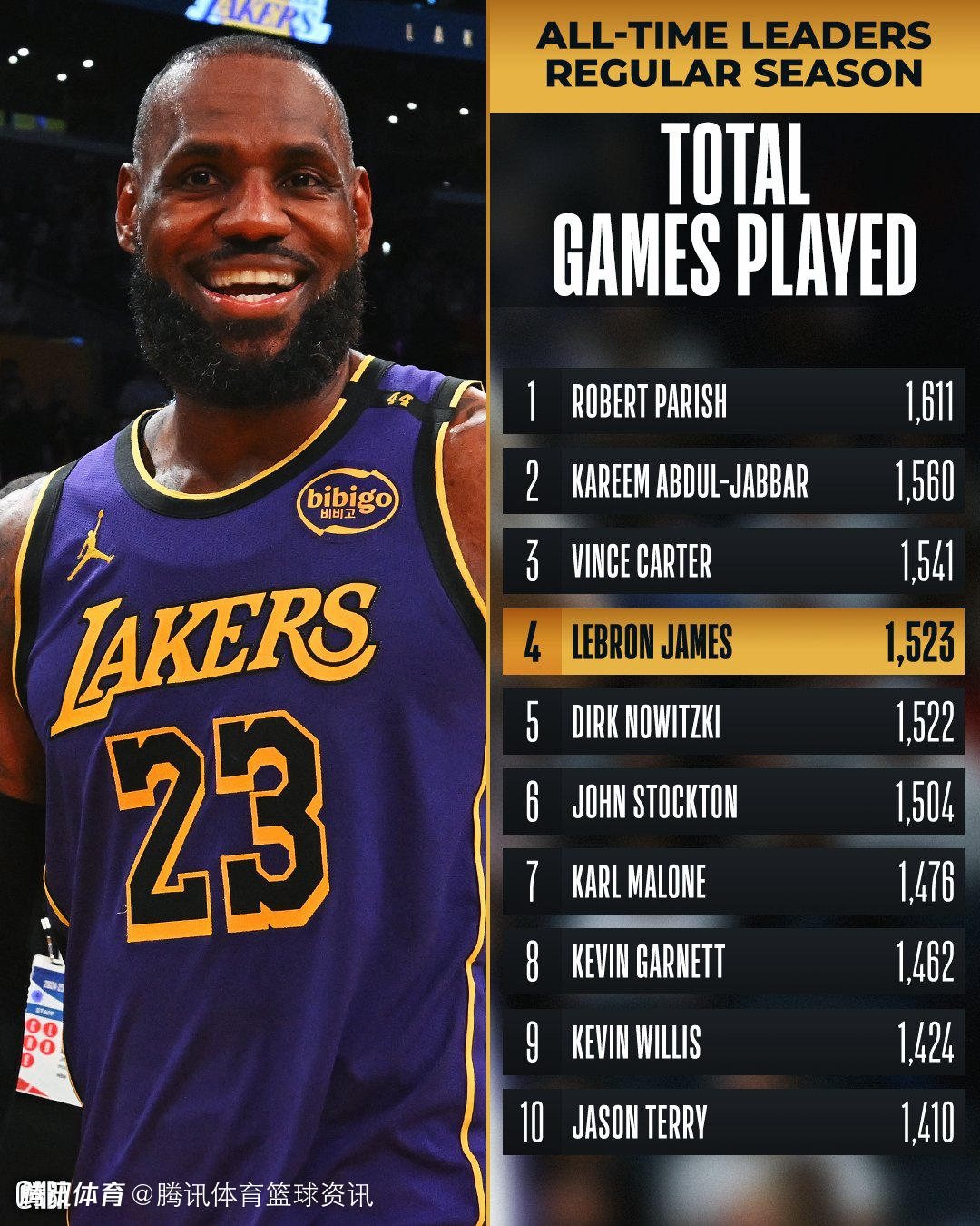 目前排在詹姆斯身前的,还剩下3位名宿,分别是帕里什(1611场)、贾巴尔(1560场)和文斯-卡特(1541场),如果詹姆斯能保持身体健康,他有望在本赛季超过卡特和贾巴尔,如果还继续征战下赛季,则有望超越帕里什。