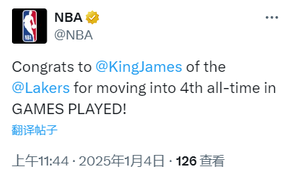NBA官方也对詹姆斯表示了祝贺,他们在官方推特上写道:“祝贺詹姆斯升至NBA常规赛历史出战场次第4位。”