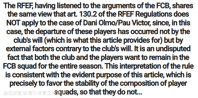 “一个不容置疑的事实是,无论是俱乐部还是球员本人,都希望他们能在本赛季继续为巴萨效力。这种对规则的解释与第130.2条的初衷相符,即旨在维护球队阵容的稳定性,以避免……(此处原文信息不完整).”
