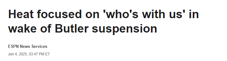 此前,热火官宣巴特勒因有损球队的行为被停薪禁赛7场,并且已经开始听取关于巴特勒的交易报价。巴特勒尚未公开对禁赛发表评论,球员工会在禁赛公告后数小时为巴特勒发声,认为热火的禁赛决定“过分且不恰当”。这次禁赛预计会造成巴特勒约240万美元的损失。