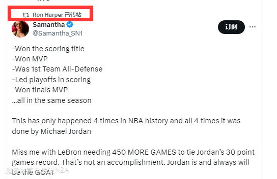 随后他还转发了一条球迷的言论,那位球迷写道:“在同一个赛季,拿下得分王、拿下常规赛MVP、入选最佳防守阵容一阵,成为季后赛得分王、赢下总决赛MVP,NBA历史上只发生过4次,而这4次都是迈克尔-乔丹创造的。詹姆斯多用了450场比赛,才追平了乔丹的得分30+纪录,这让我很失望,这根本算不上什么成就,乔丹现在是,也永远是GOAT(史上最佳)。”