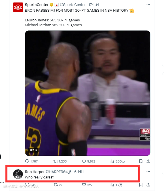 在一条詹姆斯得分30+场数超越乔丹的报道评论区,乔丹当年的后场搭档罗恩-哈珀写道:“谁真的在乎?”