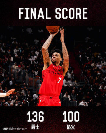 2025-01-05 11:50北京时间1月5日,NBA常规赛热火主场对阵爵士,巴特勒队内禁赛7场缺席。爵士一边倒碾压热火最多领先43分优势,尤其是次节打出40-19攻势,最终热火100-136爆冷惨负爵士遭遇2连败,爵士结束5连败。