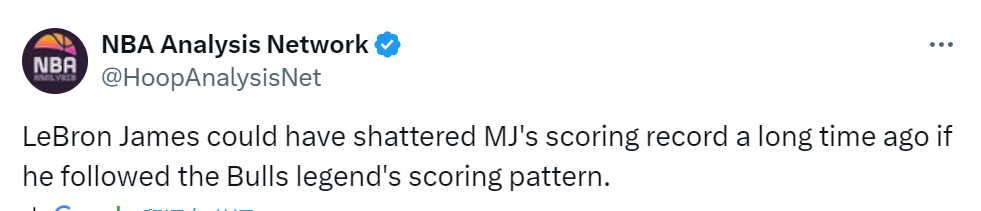 这份数据要表达的意思很明确,虽然詹姆斯打破乔丹的30+场数纪录多用了450场,但他的平均出手数远低于乔丹。换言之,美媒认为乔丹的纪录建立在更多的出手上,如果詹姆斯愿意这样打球,他早就打破30+得分的纪录。