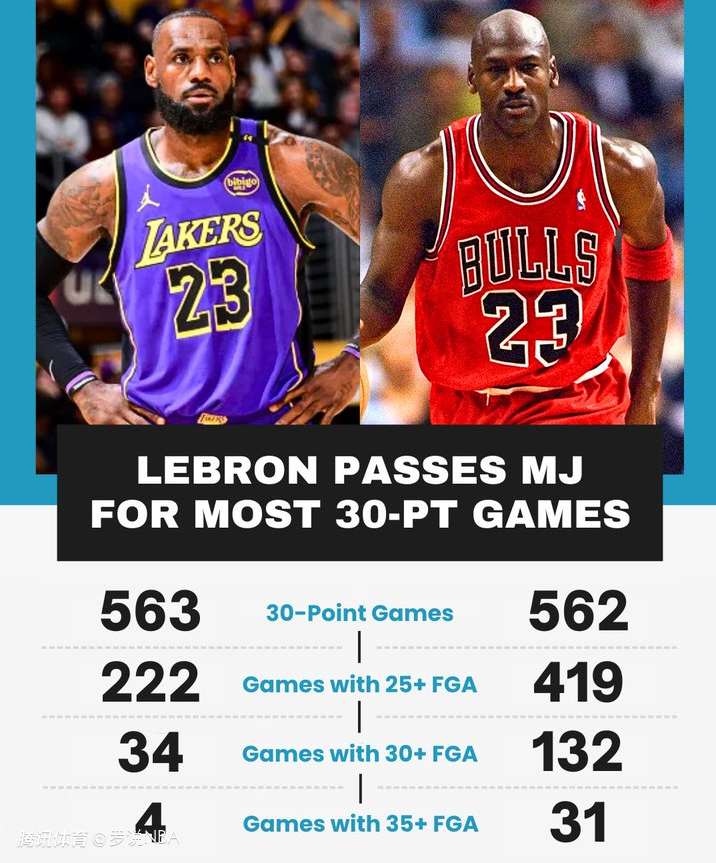 数据显示如下,詹姆斯有563场比赛得分30+,其中出手至少25次的只有222场,出手至少30次的只有34场,而出手至少35次的仅为4场。相比之下,乔丹有562场比赛得分30+,其中出手至少25次的就有419场,出手至少30次的有132场,而出手至少35次的也多达31场。