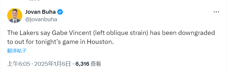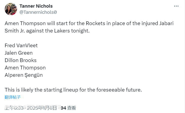 2025-01-06 07:00北京时间1月6日,湖人客场对阵火箭赛前,詹姆斯浓眉已经确定出战,文森特因左腹斜肌拉伤继续缺阵,而火箭一方,阿门-汤普森结束禁赛,将首发复出,顶替受伤的小贾巴里-史密斯。另外,伊森也继续伤停。