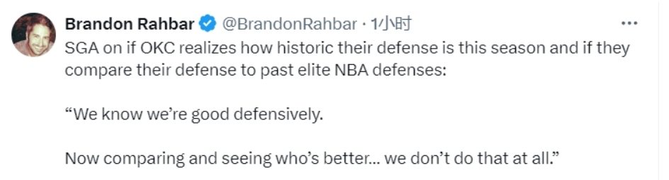 当被问及雷霆队是否意识到他们本赛季的防守是历史级别的,以及是否会将他们的防守与过往NBA的精英防守作比较时,亚历山大对此表示:“我们知道我们的防守很不错。但至于去比较,看看谁更好,我们根本不会这么做。”