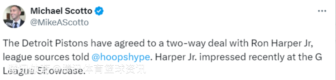 活塞和小罗恩-哈珀签下双向合同 其父亲曾是乔丹队友拿过5次总冠军
