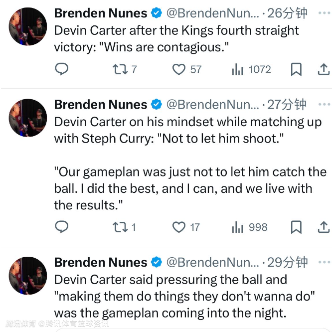 谈及自己对位库里时的心态,卡特表示:“就是不让他投篮,我们的比赛策略就是不让他接到球,我竭尽全力去做到了,我们接受比赛结果。”谈及国王目前取得的四连胜,卡特说道:“胜利是具有感染力的。”