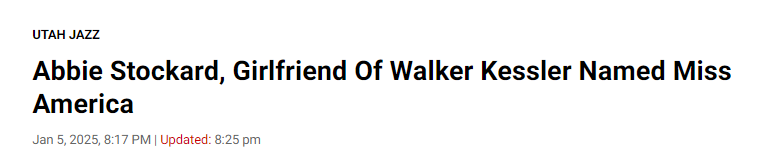 2025-01-06 17:40北京时间1月6日,在爵士105-92击败魔术的赛后,爵士球员沃克-凯斯勒收获一个好消息,他的女朋友艾比-斯托卡德力压群芳荣获2025年美国小姐。