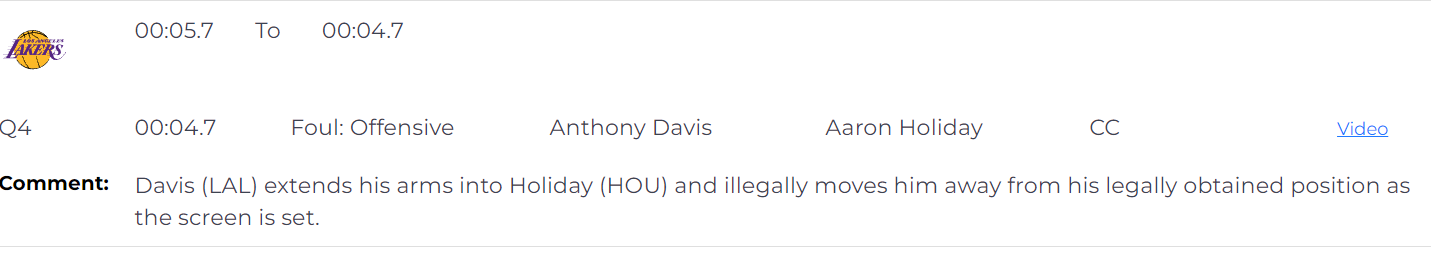 距离比赛结束还有4.7秒时,浓眉将手臂伸向阿隆-霍乐迪,并在掩护设置好后非法将他移出合法的位置,这是一次进攻犯规,裁判判定无误。