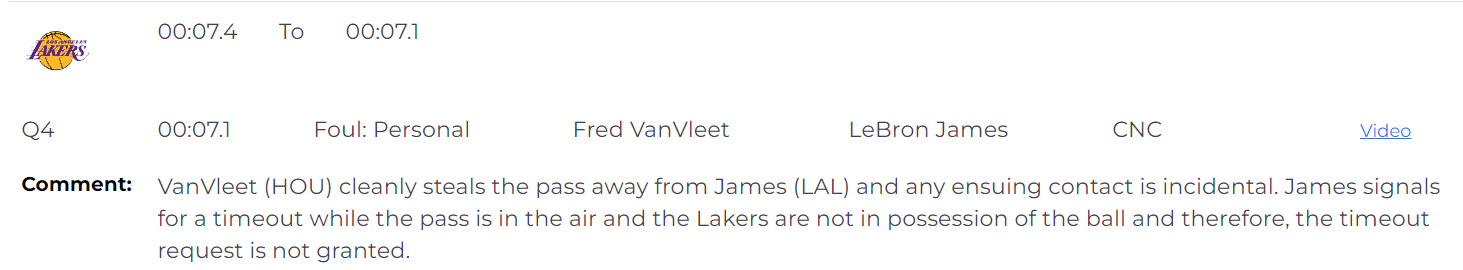 距离比赛结束还有7.1秒时,范弗利特抢断了克里斯蒂传给詹姆斯的球,抢断干净利落,没有任何犯规,随后的身体接触都是偶然的。詹姆斯在球在空中时发出暂停信号,而湖人此刻已经没有球权,暂停请求不被批准,这也是正确的。