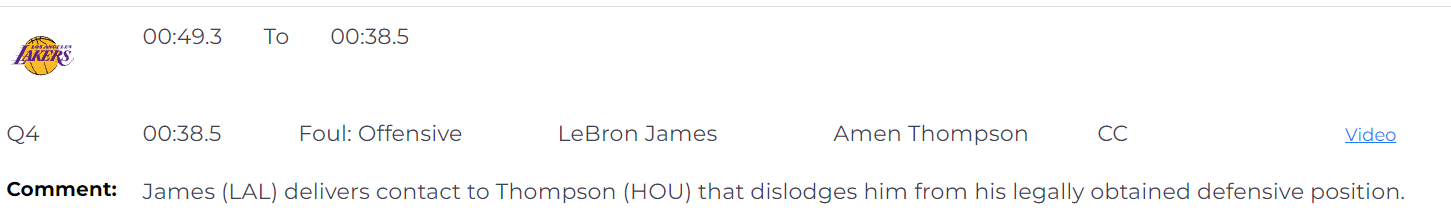 距离比赛结束还有38.5秒时,詹姆斯与阿门-汤普森发生身体接触,导致他从合法防守的位置被移开,这是一次进攻犯规,裁判判定无误。