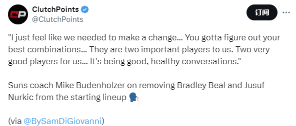 2025-01-07 08:00北京时间1月7日,NBA常规赛继续进行,太阳队对阵76人队。赛前,太阳队主教练布登霍尔泽接受媒体采访,谈到了自己将布拉德利-比尔和努尔基奇移出首发阵容的决定。