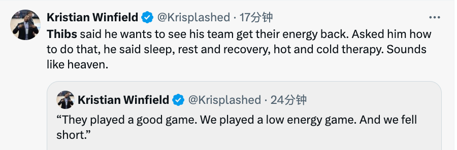 谈及今天的失利,锡伯杜表示:“魔术打得很棒,我们这场比赛打得活力不足,表现糟糕。”另外锡伯杜也表示希望球队能够恢复活力,而被记者问及如何做到这一点时,锡伯杜则是言简意赅:“睡眠、休息、恢复和冷热疗法。”