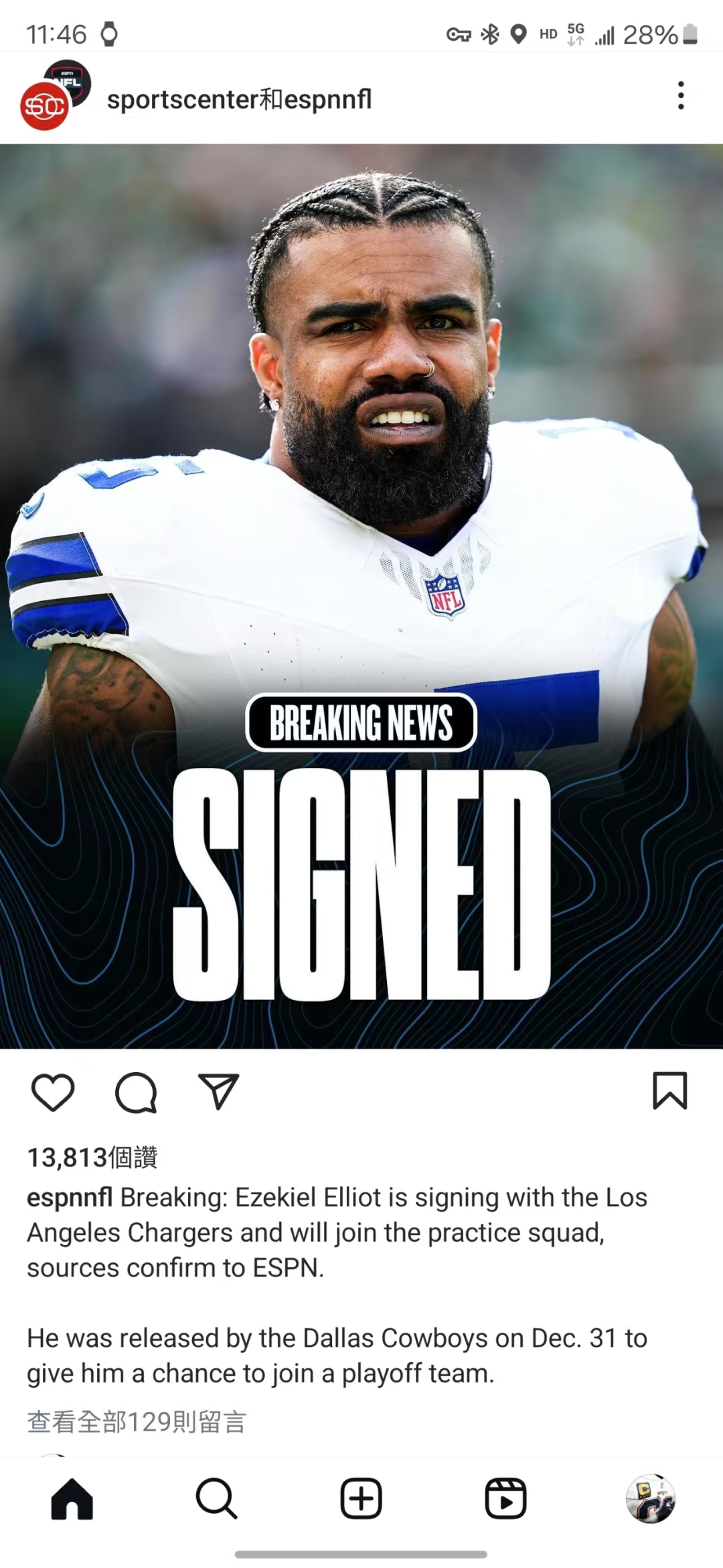 【NFL动态】大战前补强!闪电签下前牛仔跑卫埃利奥特