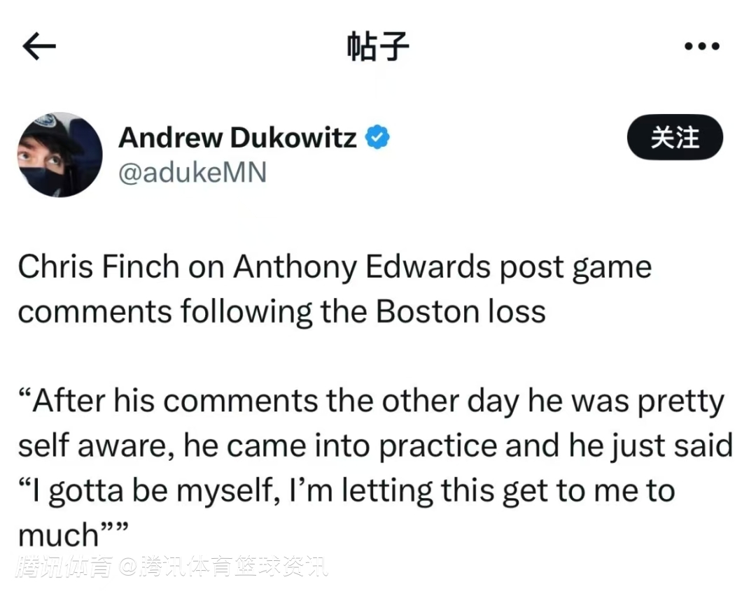 在输给凯尔特人的赛后,爱德华兹曾说自己不想整晚都在传球,还说了一些丧气言论,对此芬奇表示:“在那之后他很有自知之明,他自觉来到了训练场训练,并且说‘我必须做好我自己,这让我受影响太多了。’”