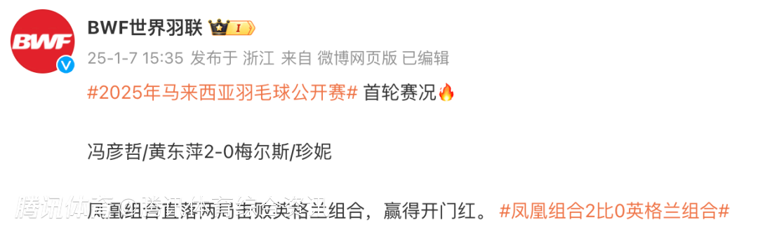 2025-01-07 16:40北京时间1月7日,2025马来西亚羽毛球公开赛首轮,冯彦哲/黄东萍2-0(21-17、21-12)战胜梅尔斯/珍妮,取得开门红。