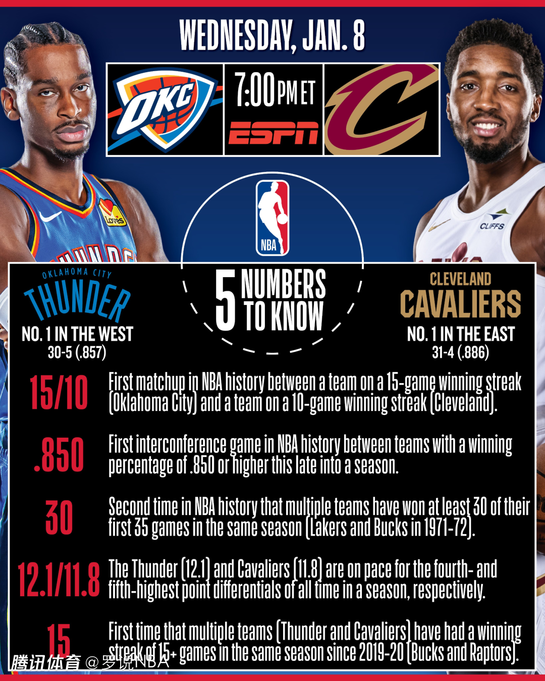 第二,这也是NBA历史上第一次来自东西部的两支胜率都在85%以上的球队之间的较量。雷霆目前30胜5负,胜率85.7%,骑士31胜4负,胜率88.6%。