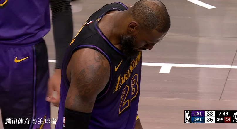 第二节,湖人3-10被反超后再次反扑,可湖人才反超6分就陷入得分荒,上半场最后2分59秒湖人全队一分未得,被独行侠打出11-0的攻势,半场打完湖人50-55落后5分;这一节詹姆斯3投0中,仅靠突破造犯规罚球拿到2分,肩膀被对手抓破了,临时接受止血治疗。