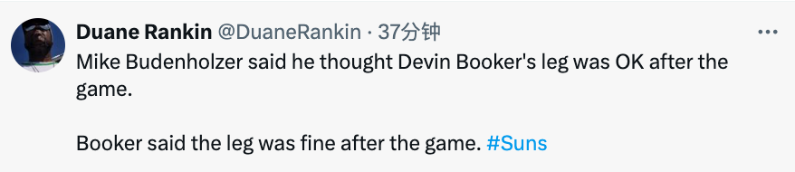 最后布登霍尔泽也透露了布克的伤情,他表示布克说自己的腿部没有问题。此役布克首发出战38分钟,空砍39分6篮板10助攻。
