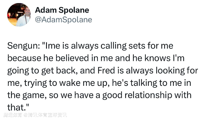 谈及自己上半场的表现,申京表示:“我开局打得很糟糕,我知道自己需要清醒过来,范乔丹在比赛中给我喂球,帮我渡过难关。”上半场申京11中4,得到8分5篮板2助攻1抢断,他本场比赛的第26分,正是在挡拆配合中接到了范乔丹的传球,完成一记上篮所获。
