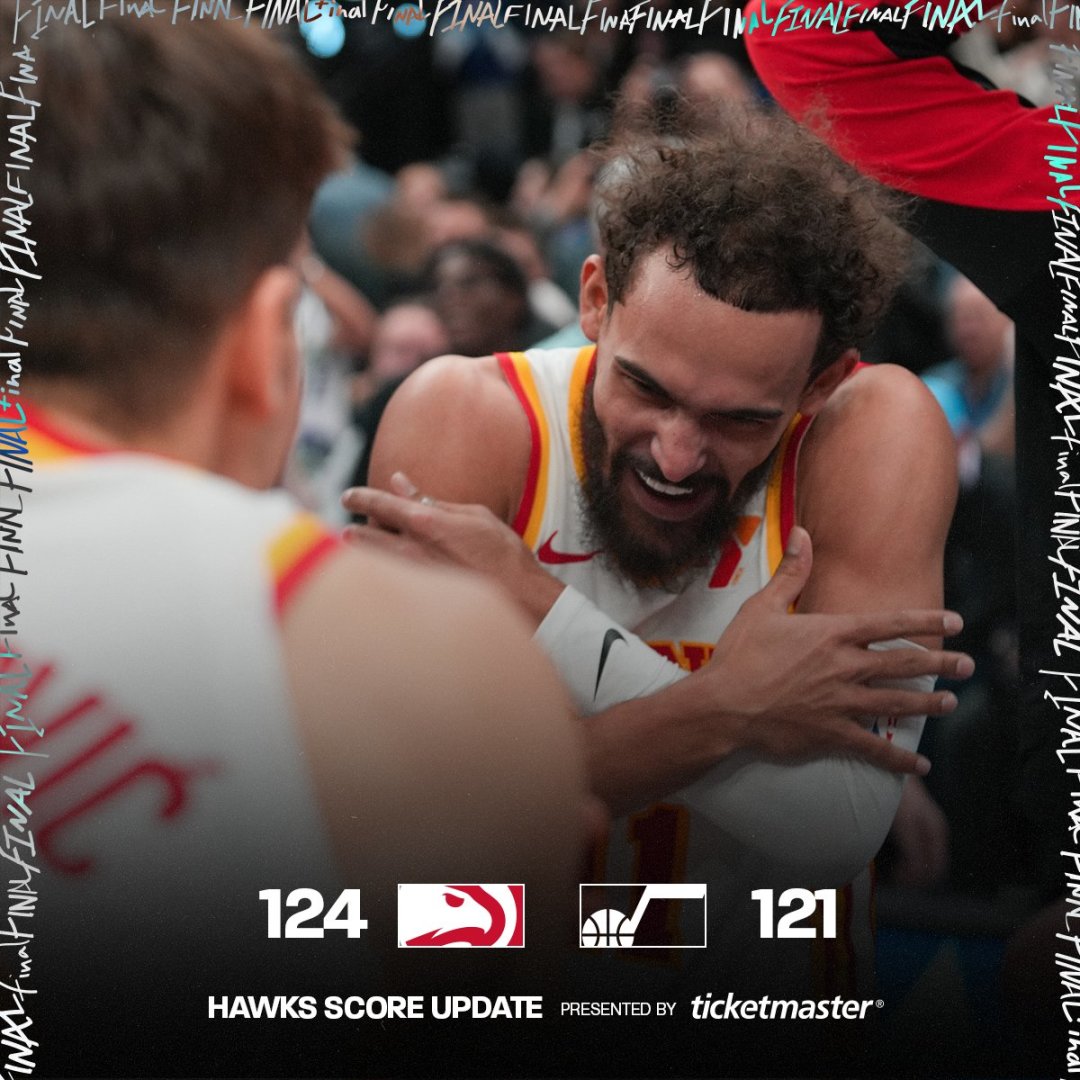 及至末节比赛,末节前3分钟老鹰被追到98-98平,老鹰多点开花逐步取得108-103领先优势,爵士连得5分追平。双方继续缠斗,凯斯勒补扣反超2分,博格丹三分回敬,凯斯勒空接暴扣,特雷杨三分反超2分。凯斯勒两罚全中,特雷杨第20次助攻连线亨特命中三分,凯斯勒补篮得分。双方随后接连打铁,特雷杨被犯规两罚全中维持3分优势,爵士请求暂停,塞克斯顿三分扳平比分。特雷杨超远压哨三分绝杀,最终老鹰124-121险胜爵士。