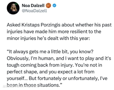 谈到过去所受的伤病是否让自己在面对今年遭遇的这些小伤时变得更有韧性,波尔津吉斯表示:“伤病总是会对我产生一些影响,你懂的。显然,我也是普通人,我渴望上场打球,而且伤后复出是很艰难的事。你身体状态并非处在最佳,可又对自己抱有很高期望。但不管是幸运还是不幸吧,我都已经经历过那些情况了。”