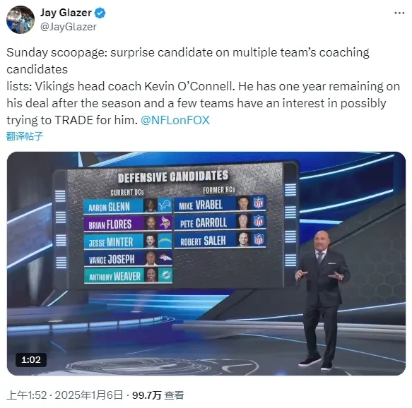 为什么其他球队认为他们可能有机会得到奥康内尔,尤其他在明尼苏达很受欢迎,似乎很喜欢执教维京人?因为当奥康内尔将在2025赛季进入合同的最后一年时,其他球队会考虑三件事: