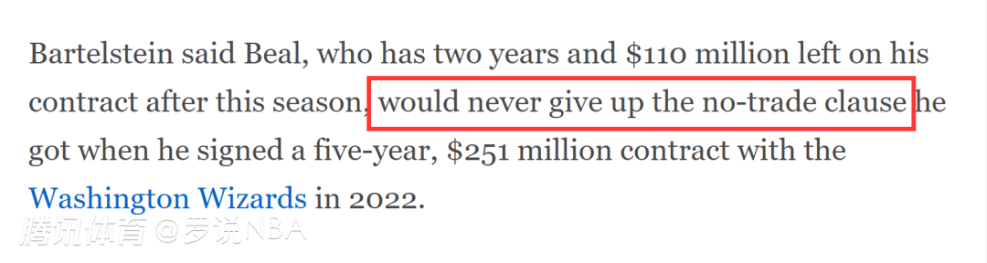 巴特尔斯坦表示,比尔本赛季结束后还有两年1.1亿美元的合同,他绝不会放弃 2022年与奇才队签订的5年2.51亿美元合同中的交易否决权。太阳目前的总年薪高达2.16亿,已经触发第二土豪线,受到交易限制,如果比尔不想被换走,他们不可能得到巴特勒。