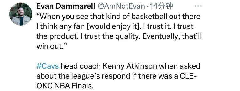 谈到如果骑士和雷霆会师本赛季NBA总决赛,联盟会作何反应时,阿特金森这样说道:“当你看到这样的篮球比赛呈现在眼前时,我认为任何球迷都会喜欢的。我相信这项赛事,更相信它的比赛质量。而最终,我们会胜出的。”