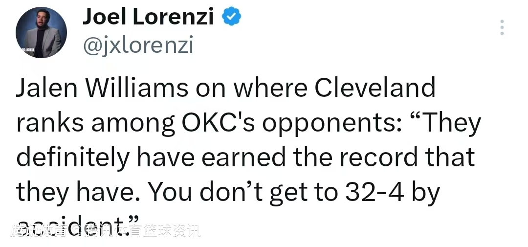谈到骑士在雷霆所有对手中所处的位置时,杰伦-威廉姆斯这样说道:“他们绝对配得上他们现在所取得的成绩。32胜4负,这样的战绩可不是偶然就能达到的。”