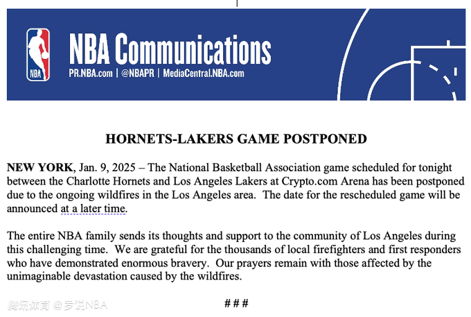 NBA官方宣布,原定于今日11点30分进行的湖人vs黄蜂一战,因洛杉矶地区持续发生的山火而推迟,新的比赛日期将在晚些时候公布。官方还表示,在这个充满挑战的时期,整个NBA大家庭向洛杉矶社区致以慰问和支持。我们感谢成千上万的当地消防员和急救人员表现出来的非凡勇气。我们为那些受到山火破坏影响的人祈祷。