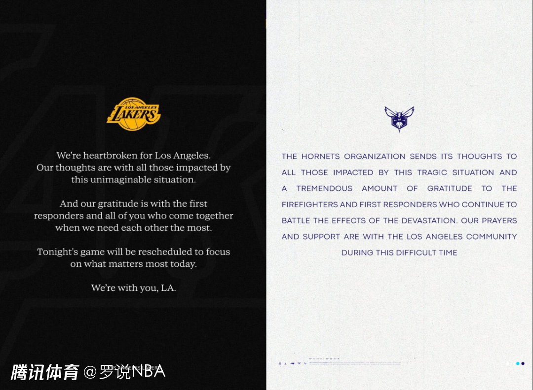 湖人官方和黄蜂官方都已经发布相关声明。湖人官方写道:“我们为洛杉矶感到心碎,我们与所有受到这种难以想象的情况影响的人同在,我们感谢急救人员,以及在我们最需要彼此的时候团结在一起的所有人,今晚的比赛将重新安排日期进行,以专注于今天最重要的事情。我们和你在一起,洛杉矶。”湖人官方还表示:“拥有今日比赛门票的球迷们,请保留你们的门票。改期进行时,你们将被致敬。”