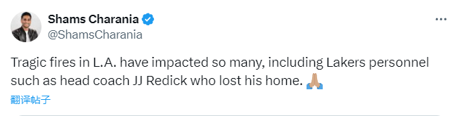 黄蜂官方写道:“黄蜂队向所有受此悲剧影响的人们致以深切的慰问,并向继续与灾难作斗争的消防员和急救人员表示衷心的感谢。在这个艰难的时刻,我们的祈祷和支持与洛杉矶社区同在。”
