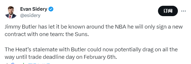 2025-01-10 05:40北京时间1月10日,据名记Evan Sidery报道,巴特勒已经向NBA公开表示,他只会与一支球队签订新合同,那支球队就是菲尼克斯太阳。Sidery还表示,热火和巴特勒的僵局可能会一直拖到2月7日的交易截止日。