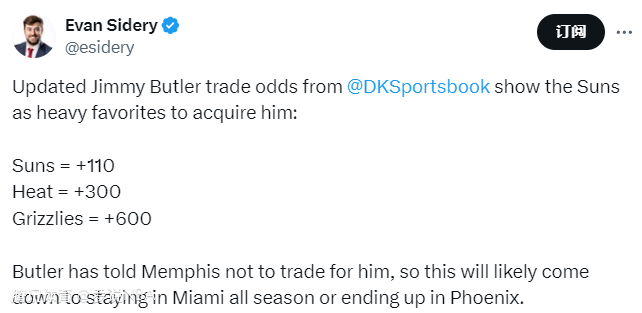 名记Amick也报道称,热火并不急于交易巴特勒,希望寻求回报最大化。热火目前处在一波6连客之中,由于巴特勒场上场下的行为问题越来越大,所以热火决定在整个6连客都禁赛巴特勒,计划回到主场再专心解决巴特勒的问题。巴特勒最新下家赔率:太阳已经升至第一,被告知无意的灰熊降到第三。