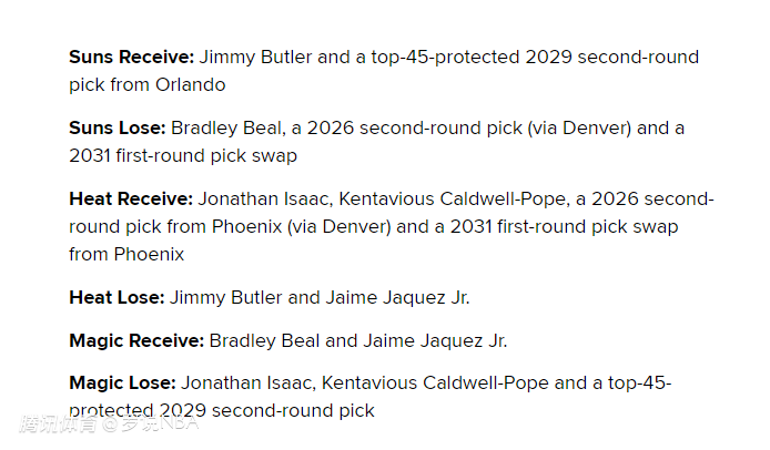 不过,巴特勒现在看来只愿意给太阳开绿灯,其他球队若是换到他,估计只有半年使用权。美媒Bleacher Report也晒出了一笔三方大交易的框架,具体如下——
