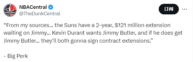 名嘴帕金斯也在节目上给出了自己的爆料。他说道:“我的消息源告诉我,太阳有一份两年1.21亿美元的续约合同等着巴特勒。杜兰特想要巴特勒,如果他得到了巴特勒,那么他们两个都会续约。”杜兰特现有的合同将在2025-26赛季后结束,本赛季薪水是5117万美元,下赛季是5470万美元。