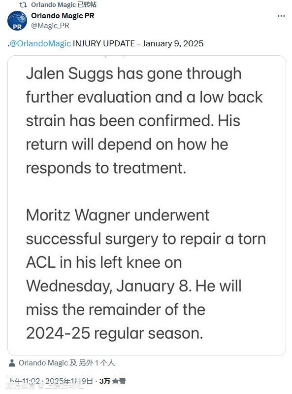 与此同时,魔术队官方宣布,球队前锋莫里茨-瓦格纳昨日成功接受了前交叉韧带修复手术,本赛季报销。大瓦格纳本赛季在18.8分钟的上场时间里场均得到12.9分和4.9个篮板。