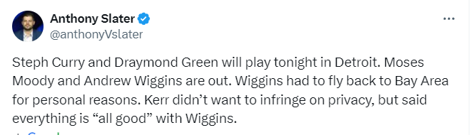 科尔表示,库里和格林将在对阵活塞的比赛中出战,穆迪和维金斯将缺席。其中,维金斯因个人原因不得不飞回湾区。科尔不想侵犯隐私,但他表示维金斯一切都很好。