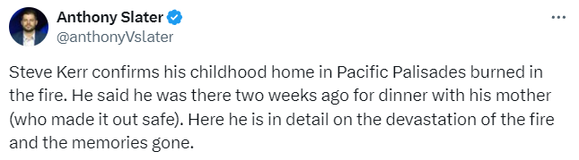 2025-01-10 07:20北京时间1月10日,勇士主帅科尔在赛前接受媒体采访时,谈及球队最新伤情和洛杉矶山火对其家人造成的影响。