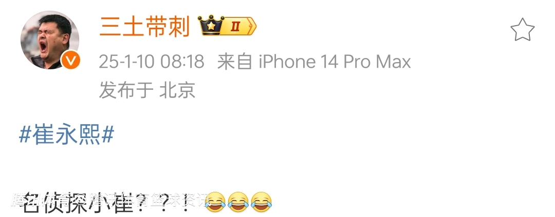 崔永熙的新造型也引起热议。篮球媒体人三土带刺晒出了小崔的这张照片,调侃道:“名侦探小崔?!” 新的开始,新的起点,一切真的是“从头开始”。