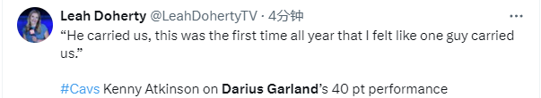 骑士主帅盛赞加兰:本赛季第一次感觉全队被一个人扛起来赢球