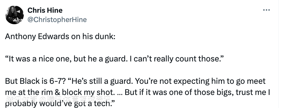 谈及自己的那记隔扣,爱德华兹表示:“那个球很棒,安东尼-布莱克虽然身高6尺7(约2米01),但他仍然是个后卫,你别指望他可以在篮下迎着我去封盖我的投篮,但如果我隔扣的是其中的一个大个子,相信我,我可能会拿到个技犯。”比赛第三节,爱德华兹从左侧突破,迎着布莱克的防守直接单臂隔扣对手,并且成功打成2+1。