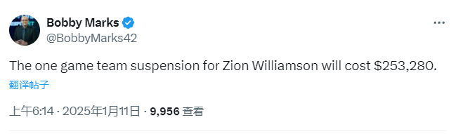 锡安禁赛一场损失25万!未赶上航班+多次训练迟到 琼斯无限期休战