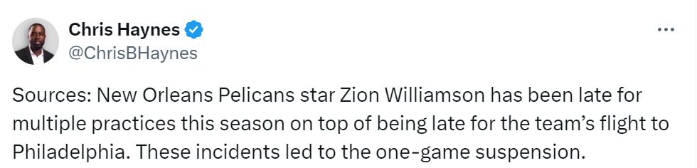 随后名记Haynes爆料称,锡安是因为迟到没能赶上昨日全队飞往费城的飞机,再加上本赛季多次训练迟到,所以鹈鹕决定对他进行一点小惩罚。锡安只禁赛1场,此前,热火以巴特勒损害球队行为禁赛了7场。赛季至今,锡安因伤只为鹈鹕打了7场比赛,场均22.6分7.7篮板5.1助攻,投篮命中率47.1%。