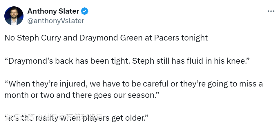 勇士队主教练科尔在赛前也接受媒体采访,谈到了两人的情况:“格林的背部一直很紧,斯蒂芬的膝盖还有积液,当他们受伤的时候,我们必须小心,否则他们会缺席一两个月,我们的赛季就完了。这就是现实,当球员变老的时候就会这样。”