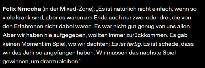 恩梅查说道:“当然,在球队有这么多球员受伤或生病的情况下进行比赛确实很困难,但最终只有两三名经验丰富的球员缺席。我们所有人的表现都未能达到应有的水平。不过,我们从未放弃,始终努力想要改变场上的局面。在比赛中,我们从未有过‘比赛已经结束’的想法,很遗憾今年的开局是这样的。我们现在必须赢得下一场比赛,以保持目前的排名。”